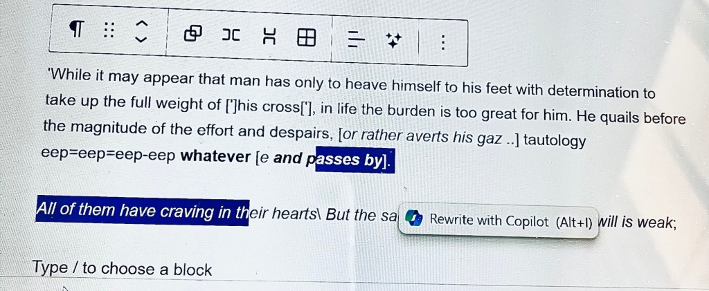 ‘While it may appear that man has only to heave himself to his feet with determination to take up the full weight of [‘]his cross[‘], in life the burden is too great for him. He quails before the magnitude of the effort and despairs, [or rather averts his gaz ..] tautology eep=eep=eep-eep whatever [e and passes by].